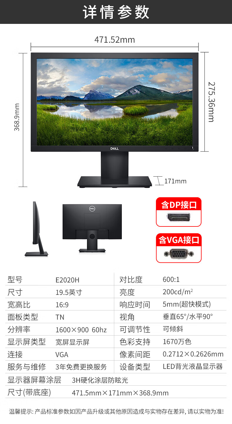 戴尔(DELL)E2020H办公商务显示器19.5英寸DP+VGA接口防眩光TN屏倾斜可调整