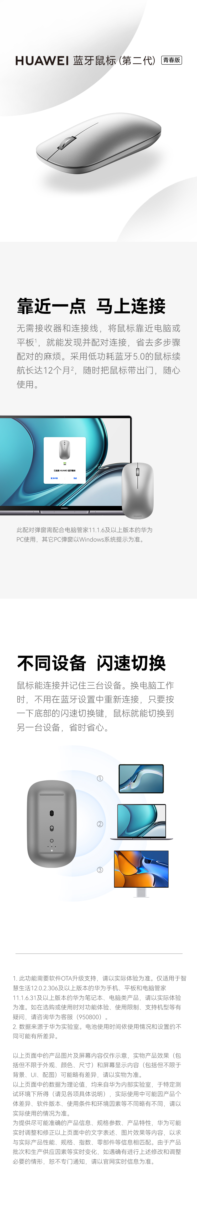华为蓝牙鼠标(第二代)青春版无线鼠标台式机笔记本鼠标适配MateBook全系笔记本电脑银色